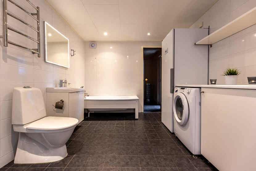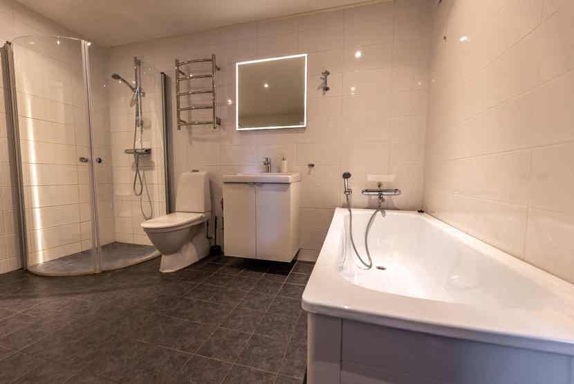 Badeværelset-1 = bruse/wc/sauna, Badekar. Badeværelset-2 = bruse/wc.