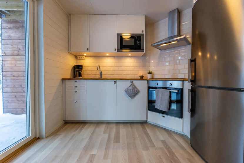 Køkkenet indeholder: elkomfur med ovn, køleskab, frys, opvaskemaskine, microovn.