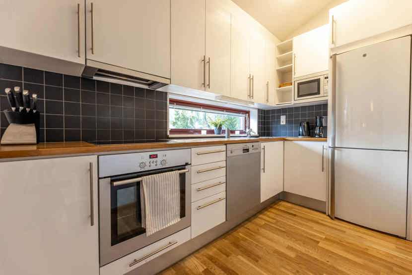 Køkkenet indeholder: elkomfur med ovn, køleskab, frys, opvaskemaskine, microovn.