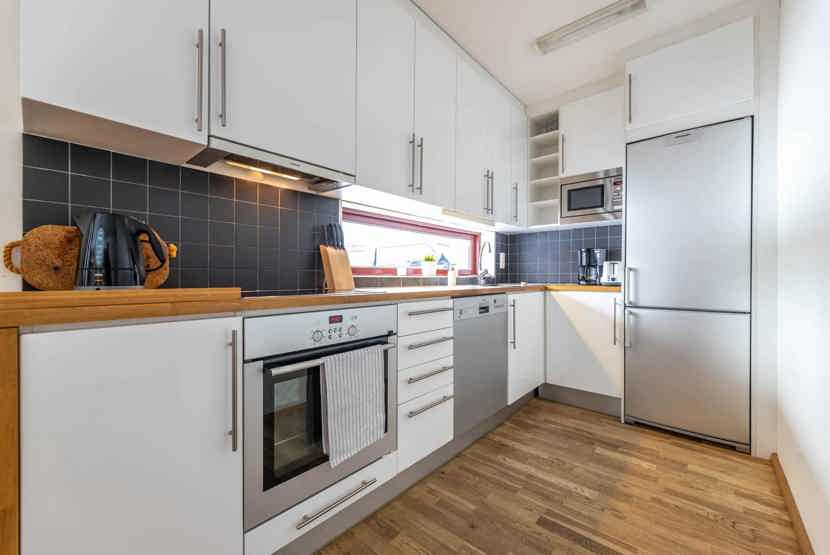 Køkkenet indeholder: elkomfur med ovn, køleskab, frys, opvaskemaskine, microovn.