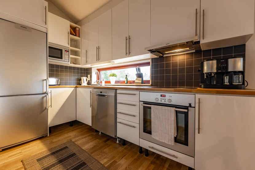 Køkkenet indeholder: elkomfur med ovn, køleskab, frys, opvaskemaskine, microovn.