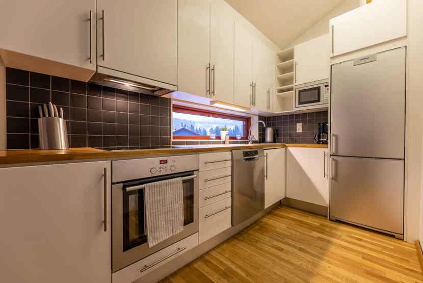 Køkkenet indeholder: elkomfur med ovn, køleskab, frys, opvaskemaskine, microovn.