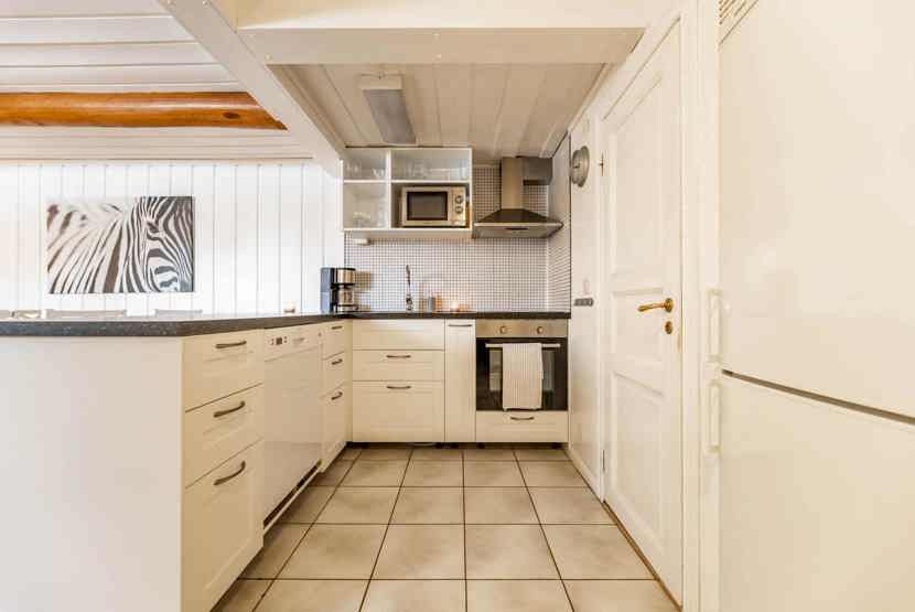 Køkkenet indeholder: Kogeplade med induktion, indbygningsovn, køleskab, frys, opvaskemaskine, microovn.