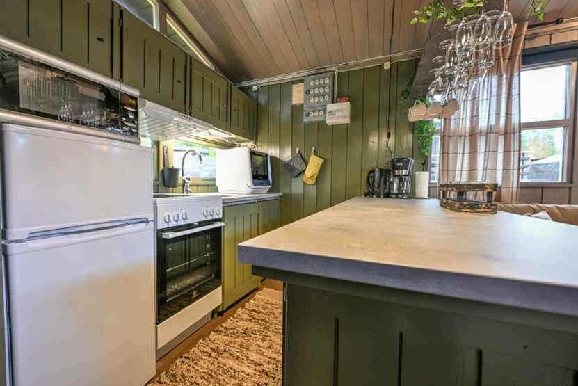 Køkkenet indeholder: elkomfur med ovn, køl med frys, opvaskemaskine, microovn.