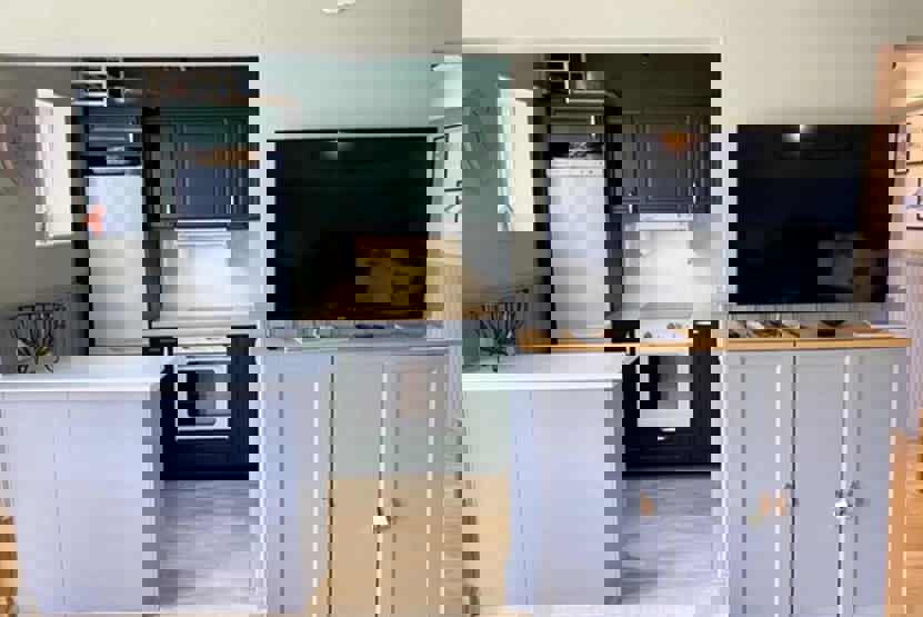 Køkkenet indeholder: elkomfur med ovn, køleskab, frys, opvaskemaskine, microovn.