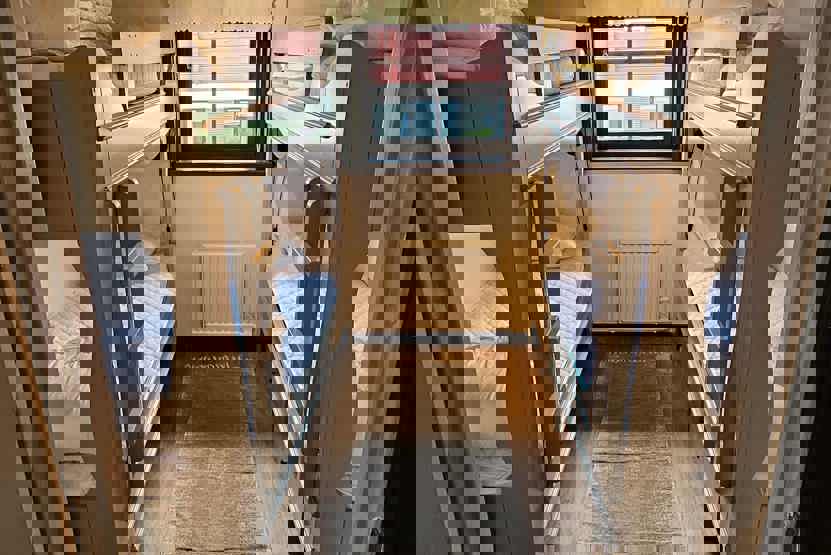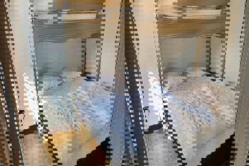 Soveværelse-1= 1 køjeseng med 160 cm bred underkøje . Soveværelse-2= 2 køjesenge hvor både over og underkøje er 80 cm bred.