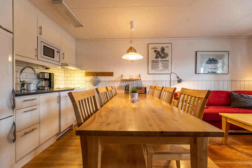Opholdsstue med køkkenafdeling. TV, tørreskab, rum til skiudstyr, altan (skovles ikke).