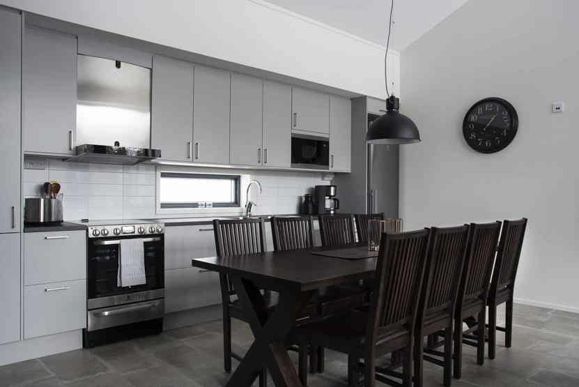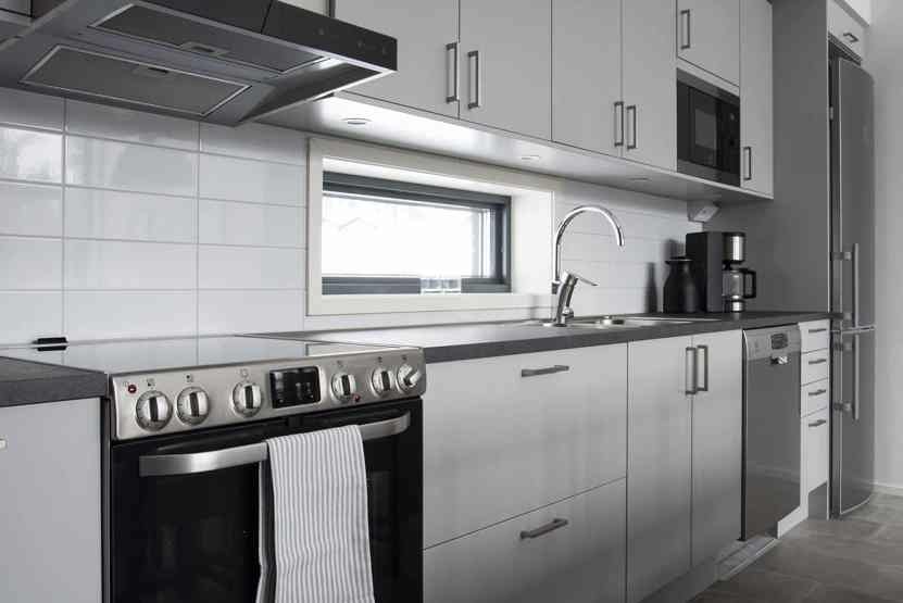 Køkkenet indeholder: elkomfur med ovn, køleskab, frys, opvaskemaskine, microovn.