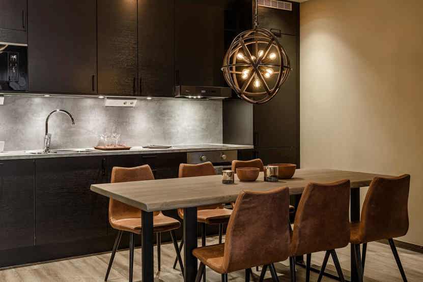 Køkkenet indeholder: kogeplade, ovn, køleskab, frys, microovn, opvaskemaskine.