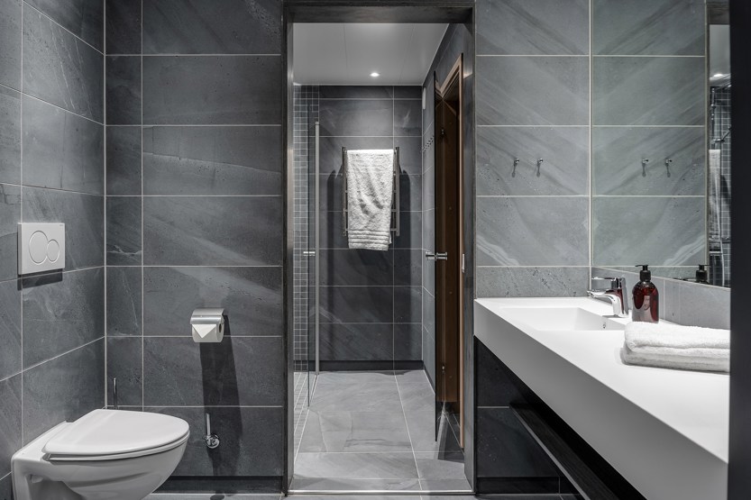 Badeværelset-1 = dobbelt brusebad, wc, sauna. Badeværelset-2 = wc.