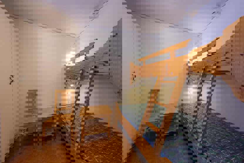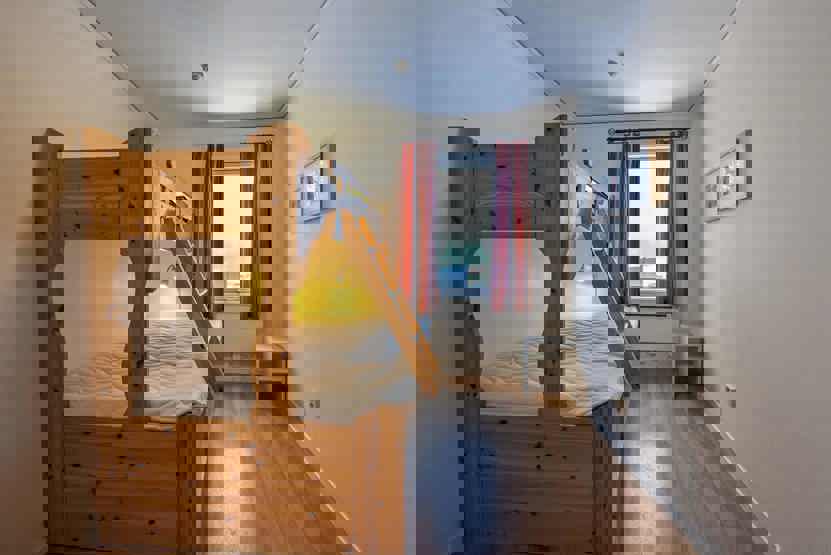 Soveværelse-1= 1 dobbeltseng 180 cm bred. Soveværelse-2= 1 køyeseng med 120 cm bred underkøye og 80 cm bred overkøye. Soveværelse-3= 1 køyeseng med 120 cm bred underkøye og 80 cm bred overkøye. Soveværelse-4= 1 dobbeltseng 180 cm bred.