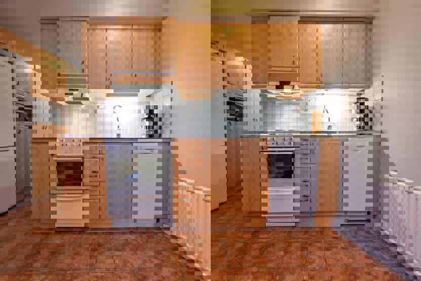 Køkkenet indeholder: elkomfur med ovn, køl med frys, opvaskemaskine, microovn.