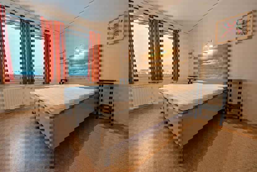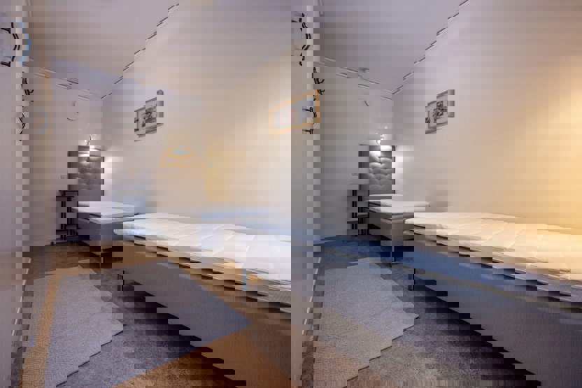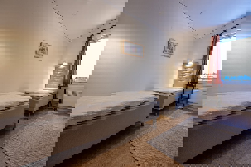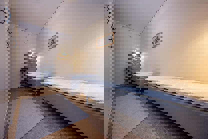 Soveværelse-1= 1 dobbeltseng 180 cm bred. Soveværelse-2= 2 enkeltsenge 90 cm bred. Soveværelse-3= 1 køyeseng med 120 cm bred underkøye og 80 cm bred overkøye.