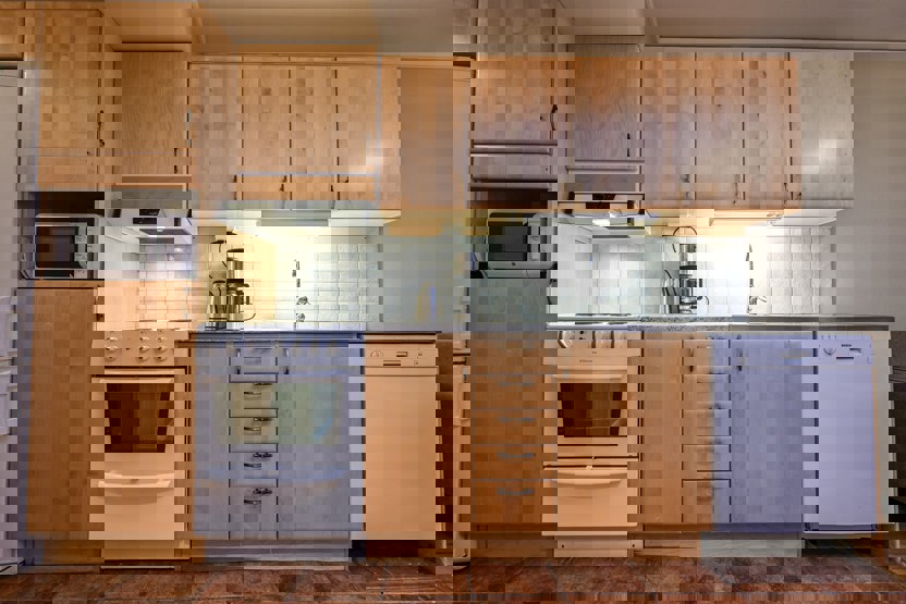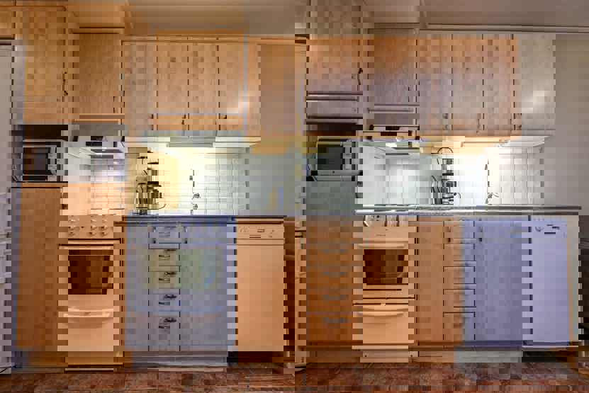 Køkkenet indeholder: elkomfur med ovn, køl med frys, opvaskemaskine, microovn.