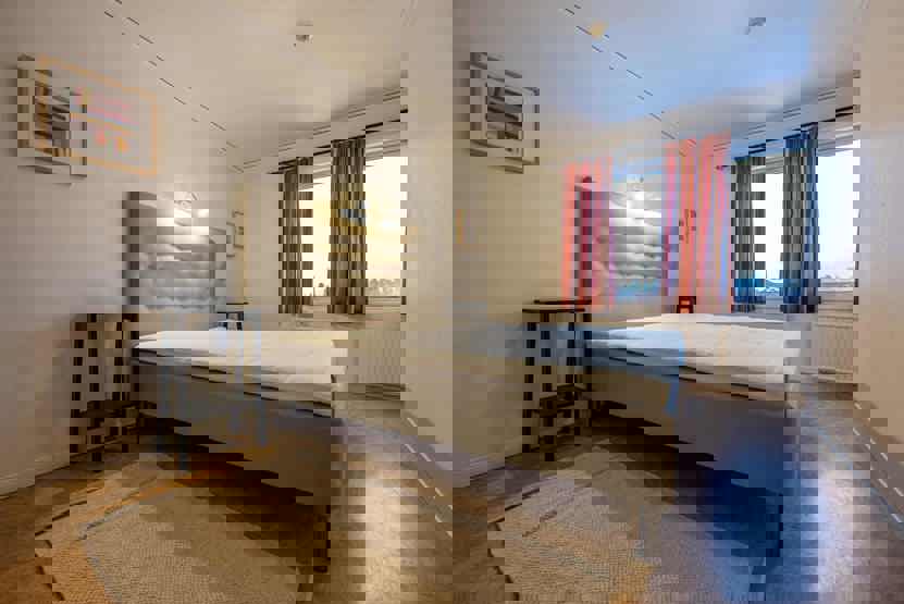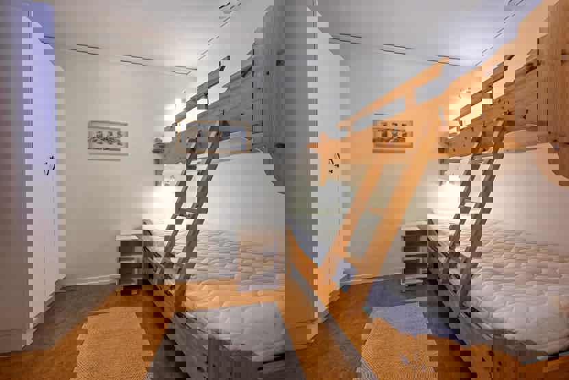 Soveværelse-1= 1 dobbeltseng 180 cm bred. Soveværelse-2= 2 enkeltsenge 90 cm bred. Soveværelse-3= 1 køyeseng med 120 cm bred underkøye og 80 cm bred overkøye.