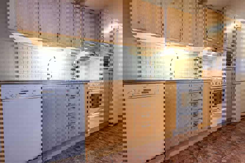 Køkkenet indeholder: elkomfur med ovn, køl med frys, opvaskemaskine, microovn.