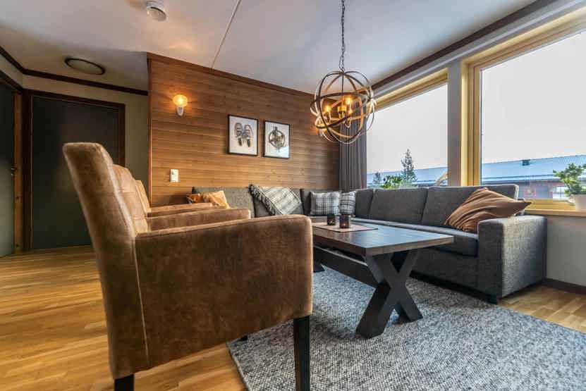 Opholdsstue med køkkenafdeling. TV, tørreskab, vaskemaskine, rum til skiudstyr, 2 parkeringspladser, adgang til fælles elbilopladere med type 2 stik mod betaling.