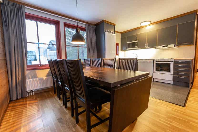 Opholdsstue med køkkenafdeling. TV, tørreskab, vaskemaskine, rum til skiudstyr, 2 parkeringspladser, adgang til fælles elbilopladere med type 2 stik mod betaling.