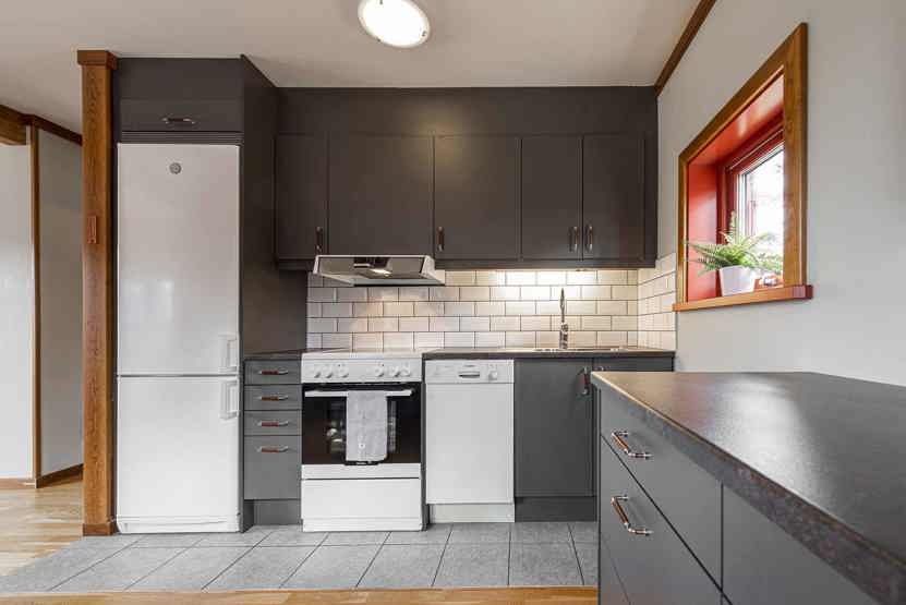 Køkkenet indeholder: elkomfur med ovn, køleskab, frys, opvaskemaskine, microovn.