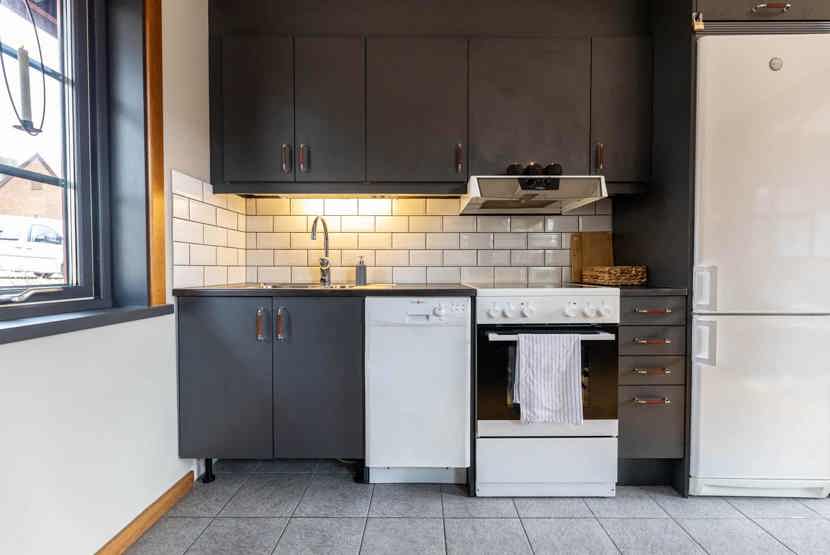 Køkkenet indeholder: elkomfur med ovn, køleskab, frys, opvaskemaskine, microovn.