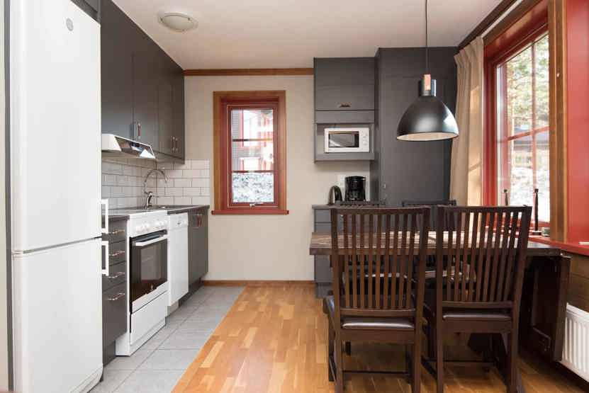 Køkkenet indeholder: elkomfur med ovn, køleskab, frys, opvaskemaskine, microovn.