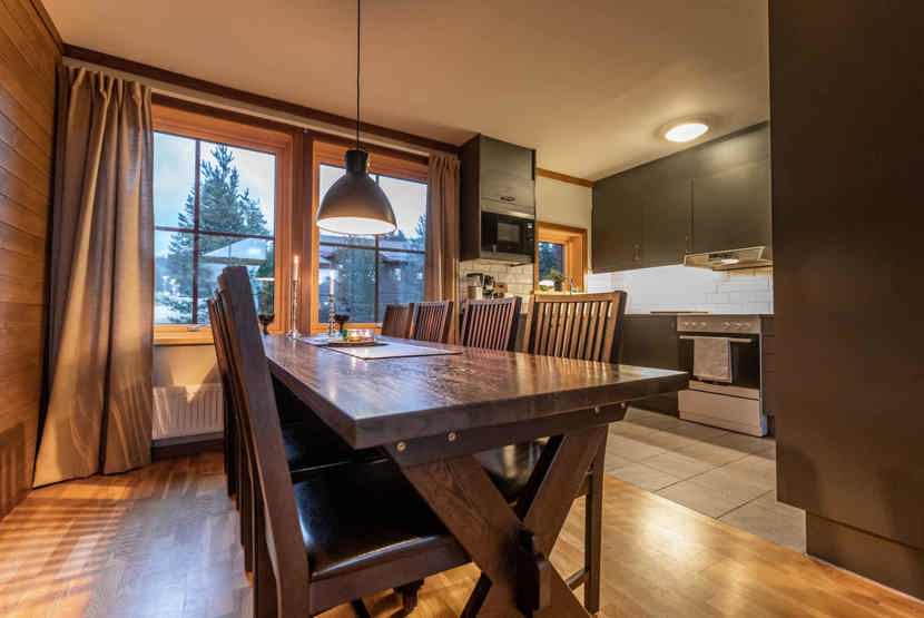 Opholdsstue med køkkenafdeling. TV, tørreskab, vaskemaskine, rum til skiudstyr, 2 parkeringspladser, adgang til fælles elbilopladere med type 2 stik mod betaling.