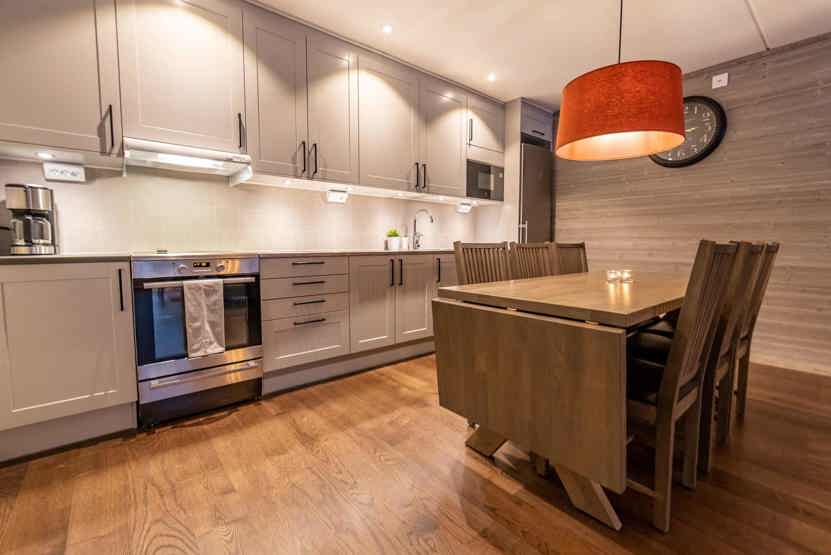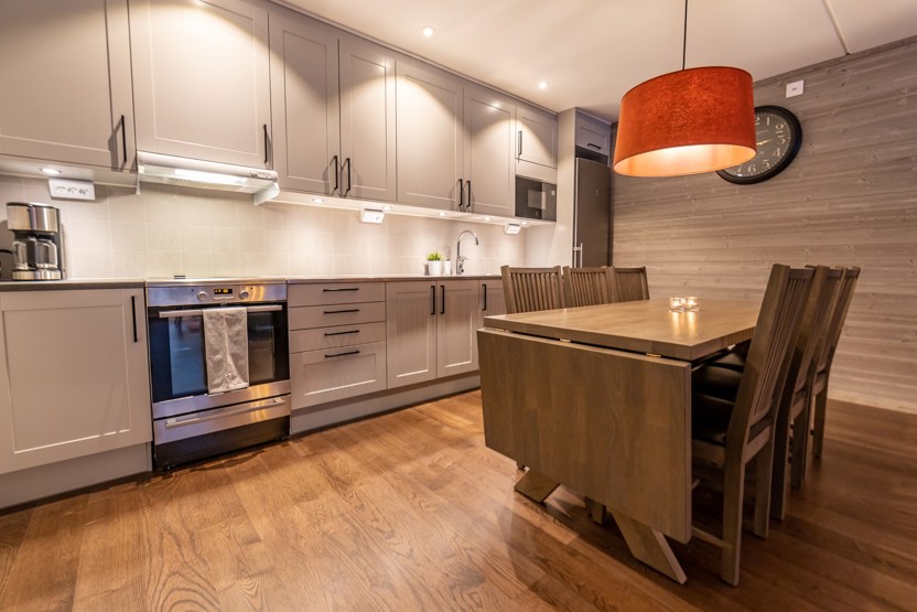 Køkkenet indeholder: keramiske kogeplader, indbygningsovn, køleskab, frys, opvaskemaskine, microovn.