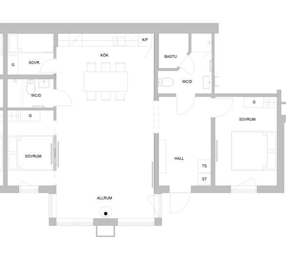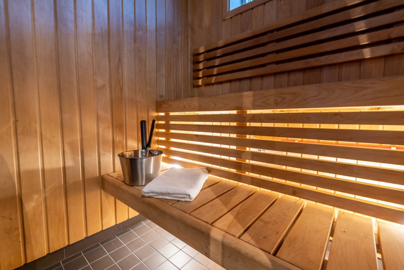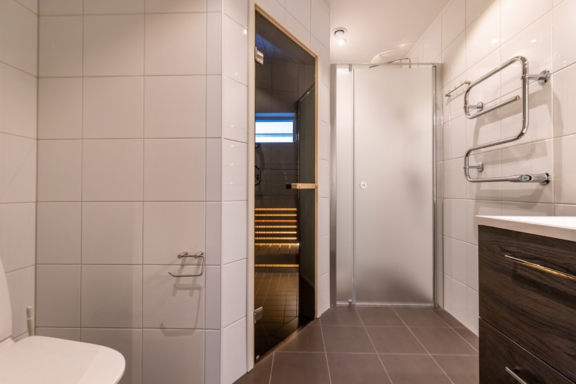 Badeværelset-1 = bruse/wc/sauna. Badeværelset-2 = bruse/wc/håndklædetørrer.