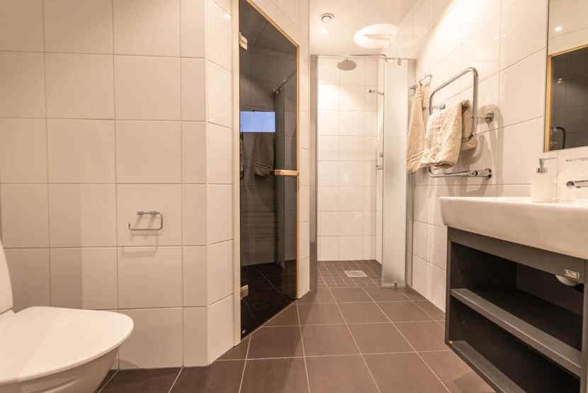 Badeværelset-1 = bruse/wc/sauna. Badeværelset-2 = bruse/wc/håndklædetørrer.