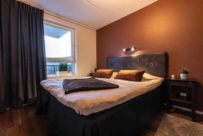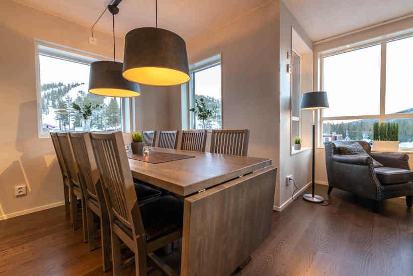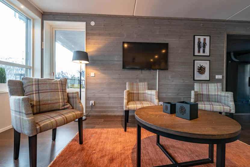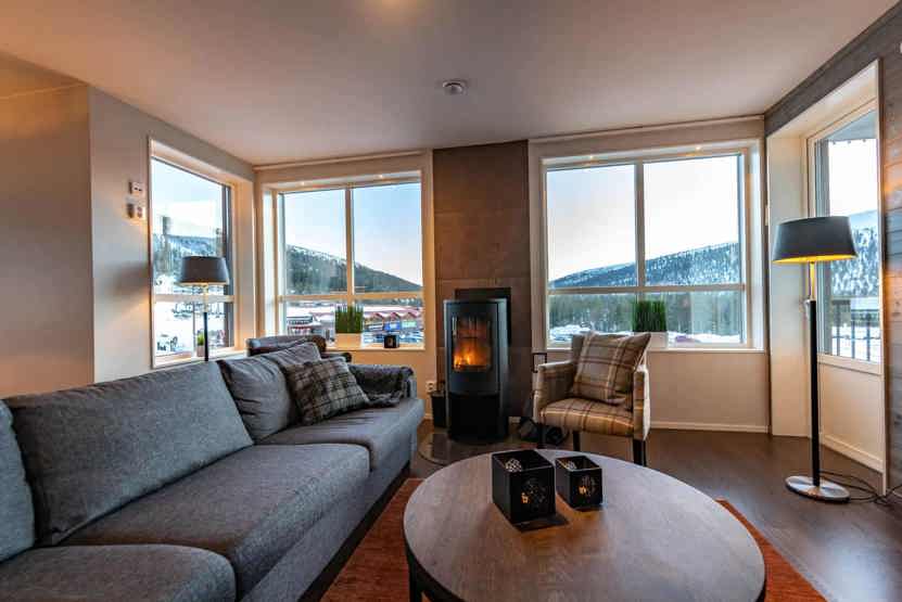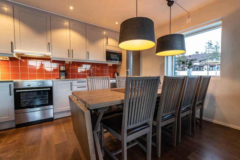 Opholdsstue med køkkenafdeling. TV, brændeovn (brænde indgår ikke), tørreskab, balkon, rum til skiudstyr, elevator findes i huset, adgang til vaskerum.