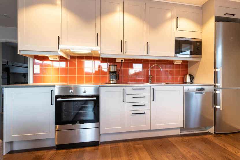 Køkkenet indeholder: keramiske kogeplader med ovn, køleskab, frys, opvaskemaskine, microovn.