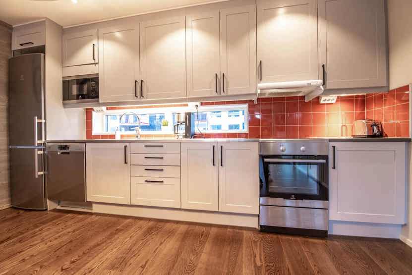 Køkkenet indeholder: keramiske kogeplader med ovn, køleskab, frys, opvaskemaskine, microovn.