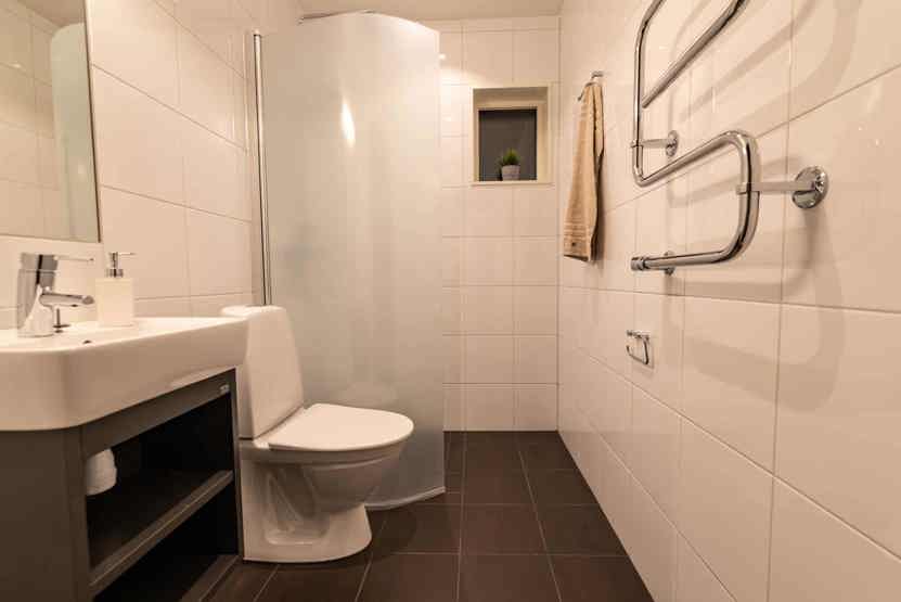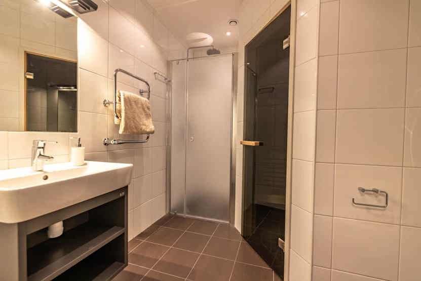 Badeværelset-1 = bruse/wc/sauna. Badeværelset-2 = bruse/wc/håndklædetørrer.
