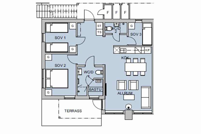 Solbacken ligger i Tandådalen. Stuelejlighed, 6 sengepladser, 75 m², alrum med køkkenafdeling, 3 soveværelser, 2 brusere, 2 WC, sauna.