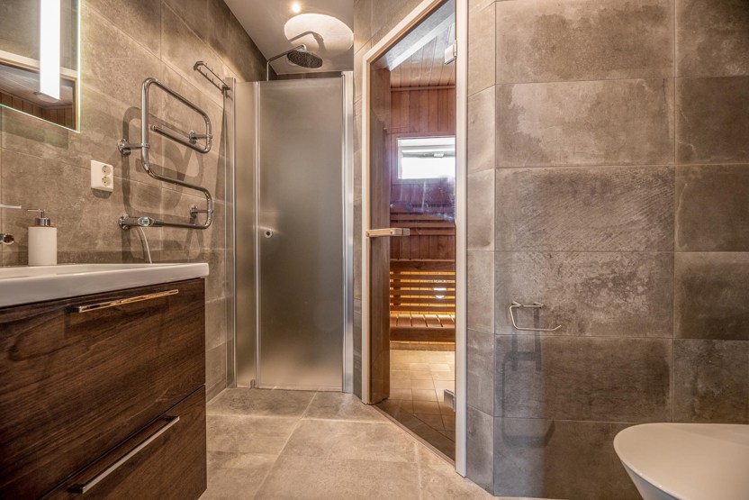Badeværelset-1 = bruse/wc/sauna. Badeværelset-2 = bruse/wc.
