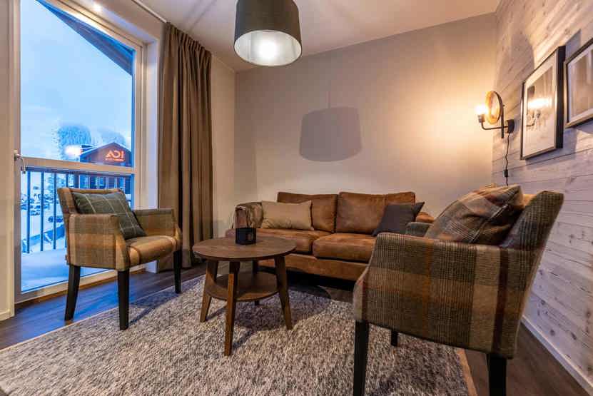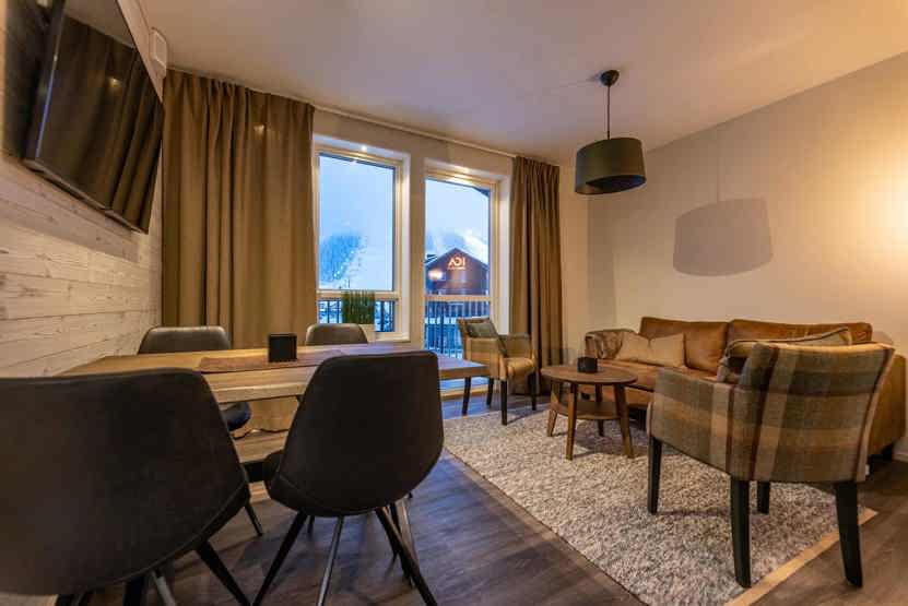 Opholdsstue med køkkenafdeling. TV, tørreskab, balkon, rum til skiudstyr, elevator findes i huset, adgang til vaskerum.