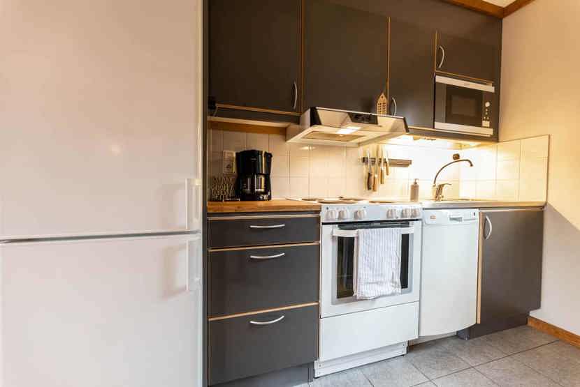 Køkkenet indeholder: elkomfur med ovn, køleskab, frys, opvaskemaskine, microovn.