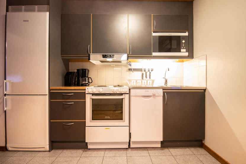 Køkkenet indeholder: elkomfur med ovn, køleskab, frys, opvaskemaskine, microovn.