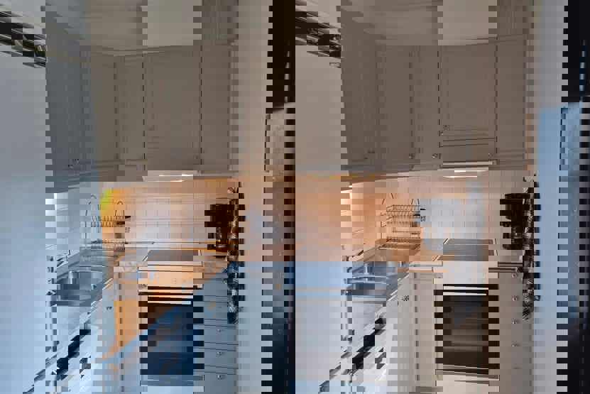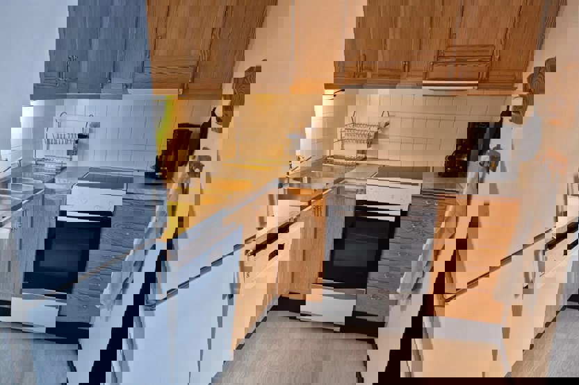 Køkkenet indeholder: elkomfur med ovn, køleskab, frys, opvaskemaskine, microovn.