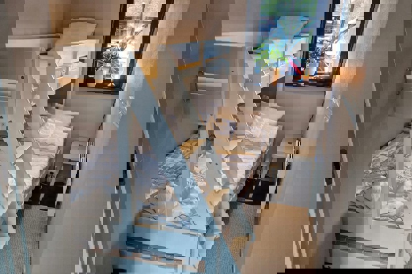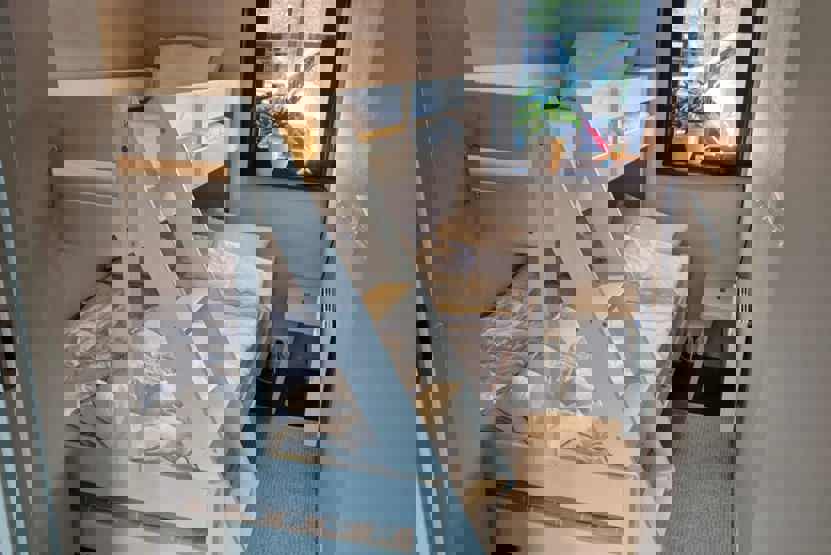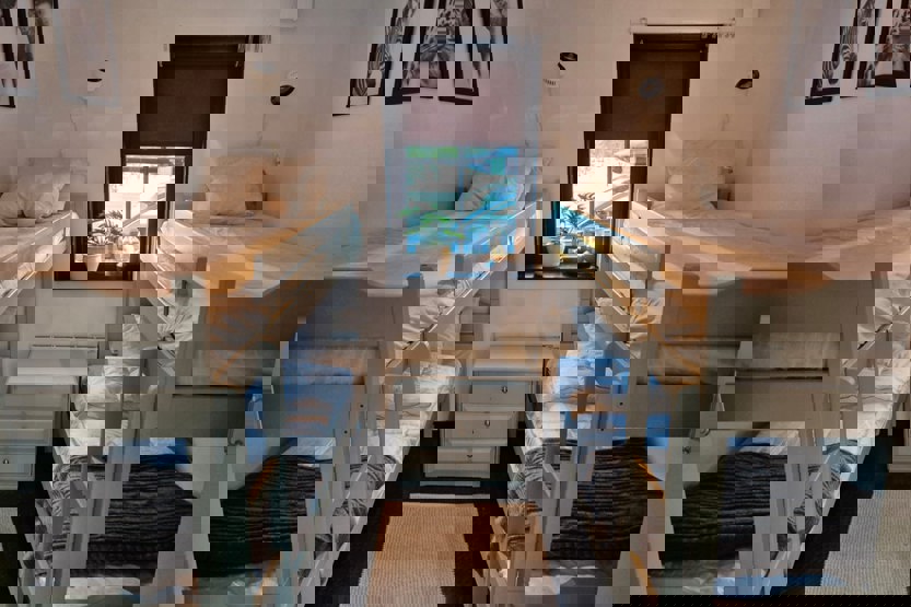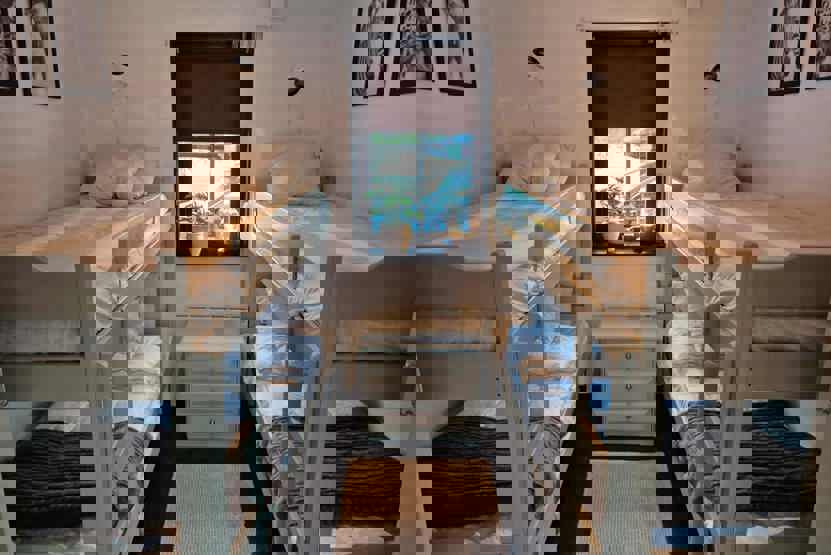 Soveværelse-1= 2 køjesenge hvor både over og underkøje er 80 cm bred. Soveværelse-2= 1 køyeseng med 120 cm bred underkøye og 80 cm bred overkøye.