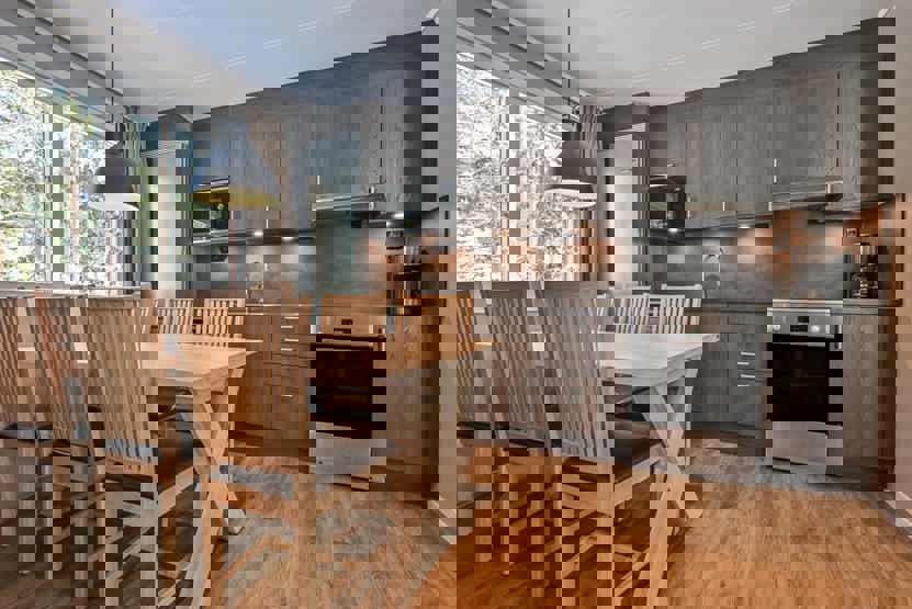 Køkkenet indeholder: elkomfur med ovn, køleskab, frys, microovn, opvaskemaskine.