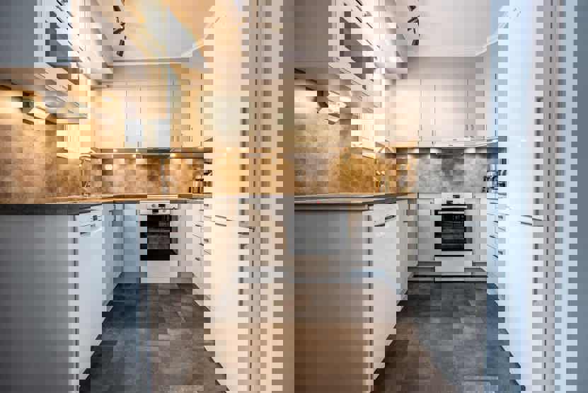 Køkkenet indeholder: elkomfur med ovn, køleskab, frys, opvaskemaskine, microovn.