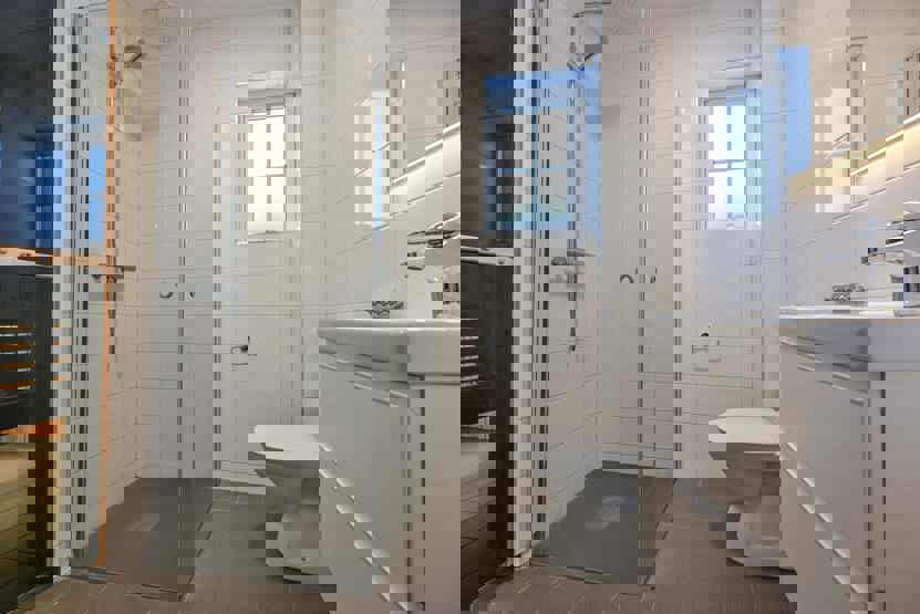 Badeværelset-1 = bruse/wc/sauna. Badeværelset-2 = bruse/wc.