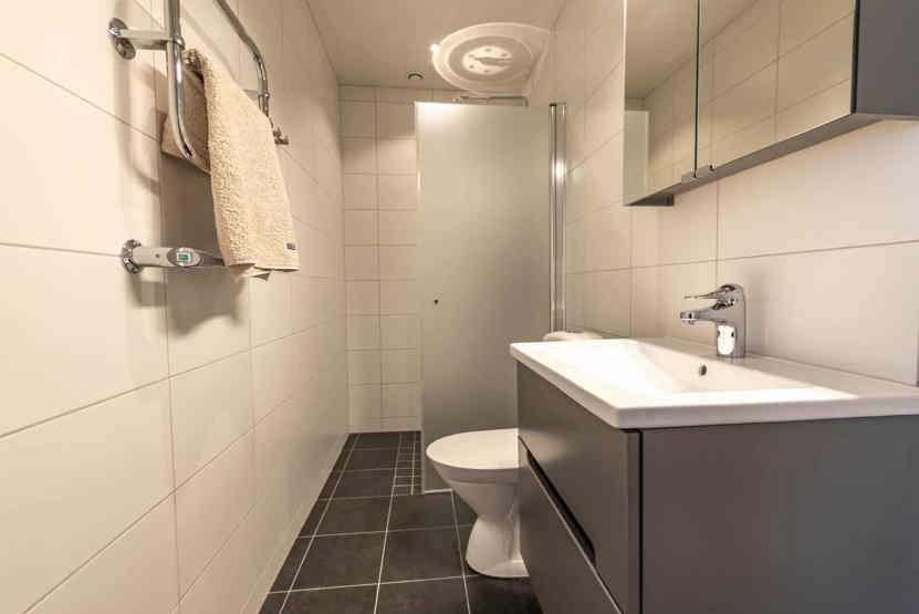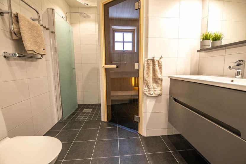 Badeværelset-1 = bruse/wc/sauna. Badeværelset-2 = bruse/wc/håndklædetørrer.
