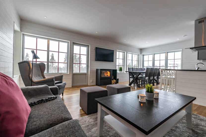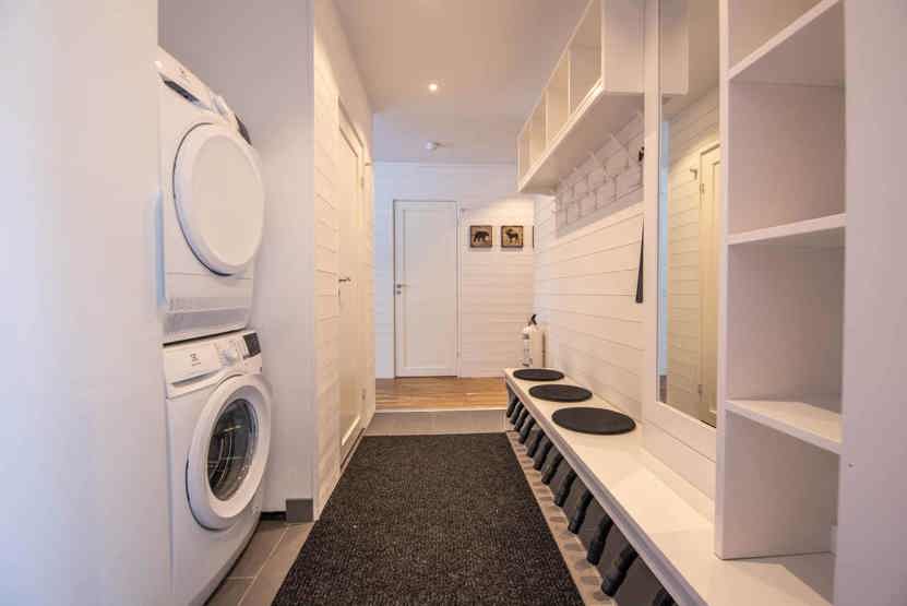 TV, åben pejs (brænde indgår ikke), skistøvletører, tørreskab, vaskemaskine, tørretumbler, rum til skiudstyr, altan (skovles ikke).