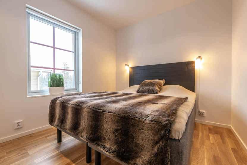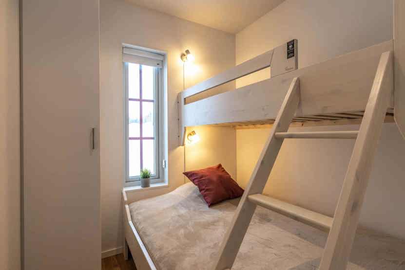 Soveværelse-1= 1 dobbeltseng 160 cm bred. Soveværelse-2= 1 køyeseng med 140 cm bred underkøye og 80 cm bred overkøye. Soveværelse-3= 1 køyeseng med 140 cm bred underkøye og 80 cm bred overkøye. Soveværelse-4= 1 dobbeltseng 160 cm bred.