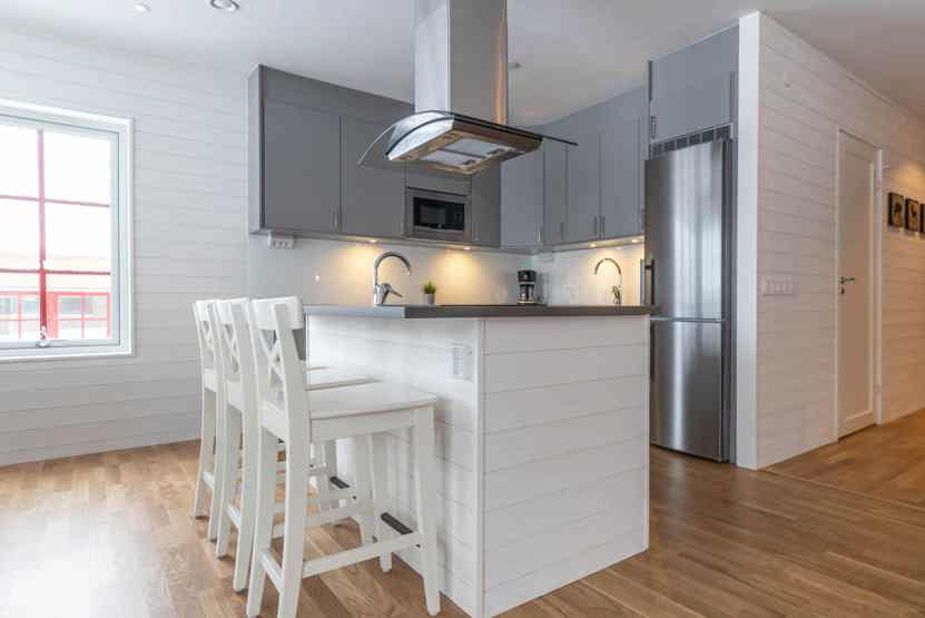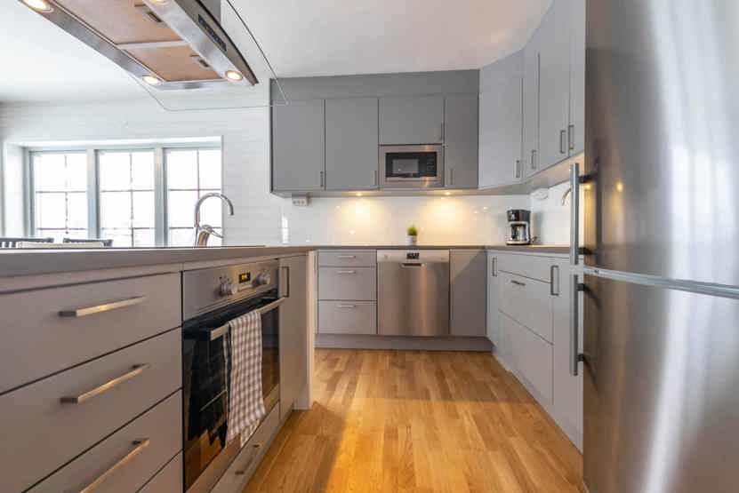 Køkkenet indeholder: keramiske kogeplader, indbygningsovn, køleskab, frys, opvaskemaskine, microovn.