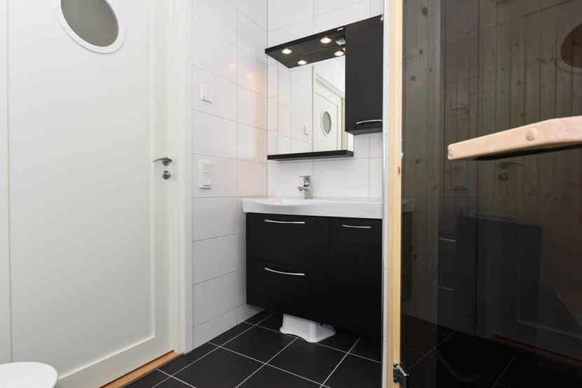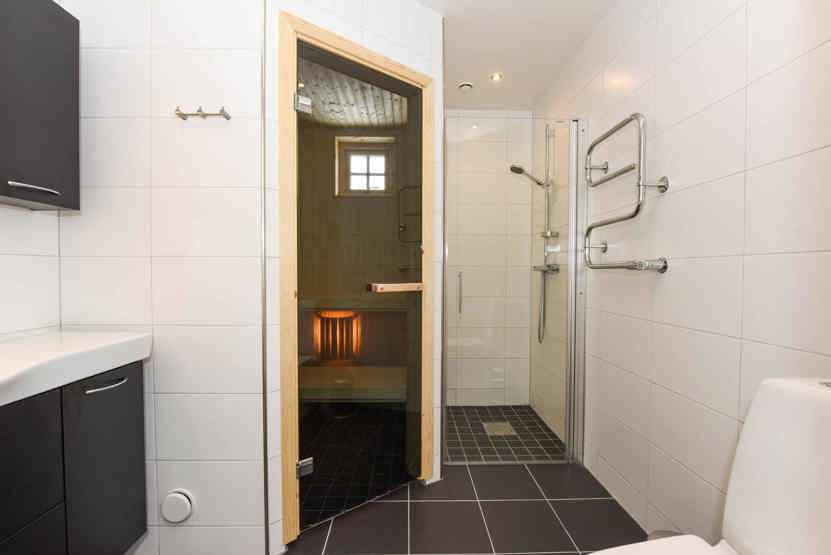 Badeværelset-1 = bruse/wc/sauna. Badeværelset-2 = bruse/wc/håndklædetørrer.