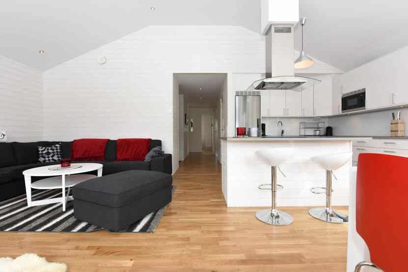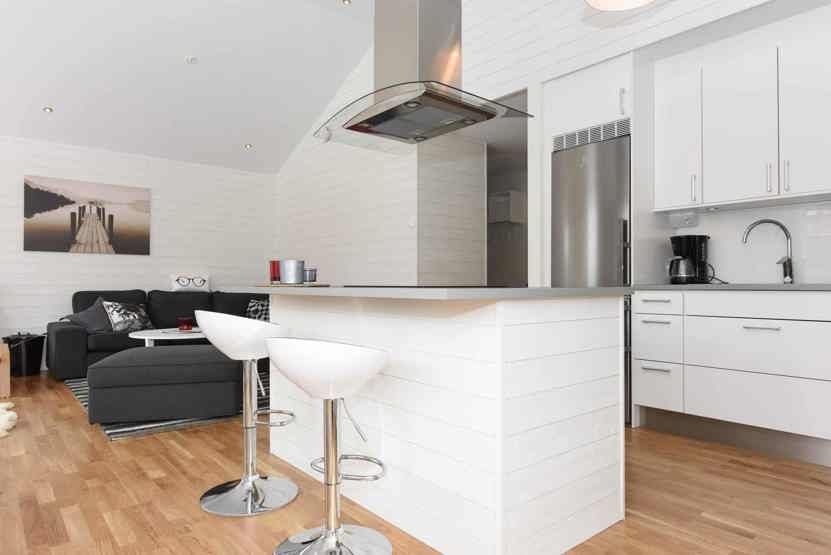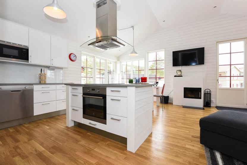 Køkkenet indeholder: keramiske kogeplader med ovn, køleskab, frys, opvaskemaskine, microovn.