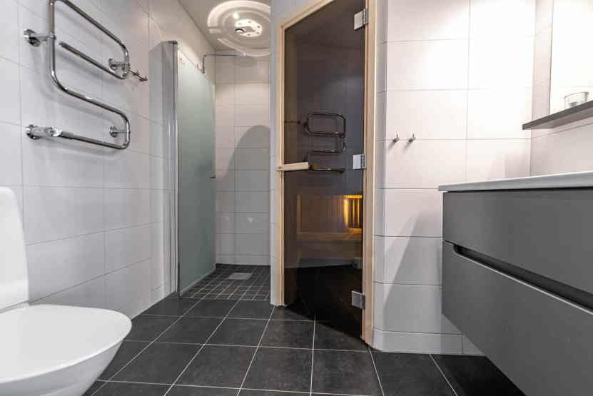 Badeværelset-1 = bruse/wc/sauna. Badeværelset-2 = wc.